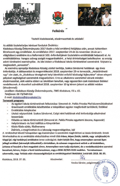 Kisdobsza Község Önkormányzata helytörténeti kutatást szervez a helyi iskola történetéről. Ezért kéri a jelenlegi és az elszármazott lakosokat, hogy segítsék a kutatást a rendelkezésükre álló írásos, képes emlékekkel. A részleteket az alábbi felhívásban olvashatják.